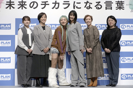 「プラン ガールズムーブメント2025」で「未来のチカラになる言葉」をテーマにトークショーを行った尾崎里紗さん、シェルバ英子さん、あっこゴリラさん、山本美月さん、クリス智子さん、根村絵美子さん=8日 【時事通信フォト】