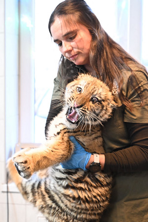8日、ハンガリーの首都ブダペストの動物園で飼育員に抱かれ、大きく口を開ける生後3カ月のトラ。違法に飼育されていたとみられ、警察による麻薬関連の捜査中に見つかった。 【AFP時事】