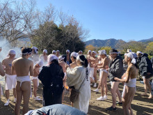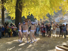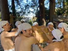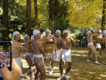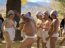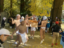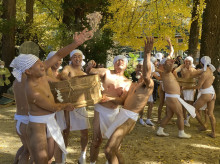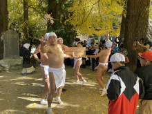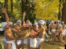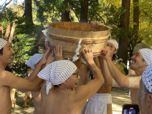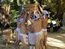 当日、宮司を先頭に赤飯の入った「盤台」(木製の供物台)を担ぐ一行が神社へ到着。神事が行われた後、同神社はだか祭り保存会の小泉裕一会長は「この祭りが続けられるのは、地元企業の皆さんの支援のおかげ」と感謝の気持ちを伝える。