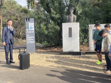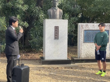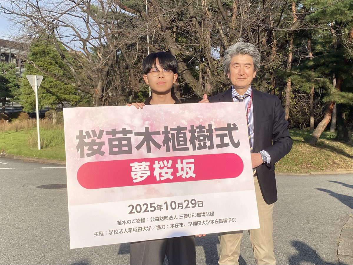 「夢桜坂」命名者となった早稲田大学本庄高等学院の大塚隼平さんと半田亨学院長