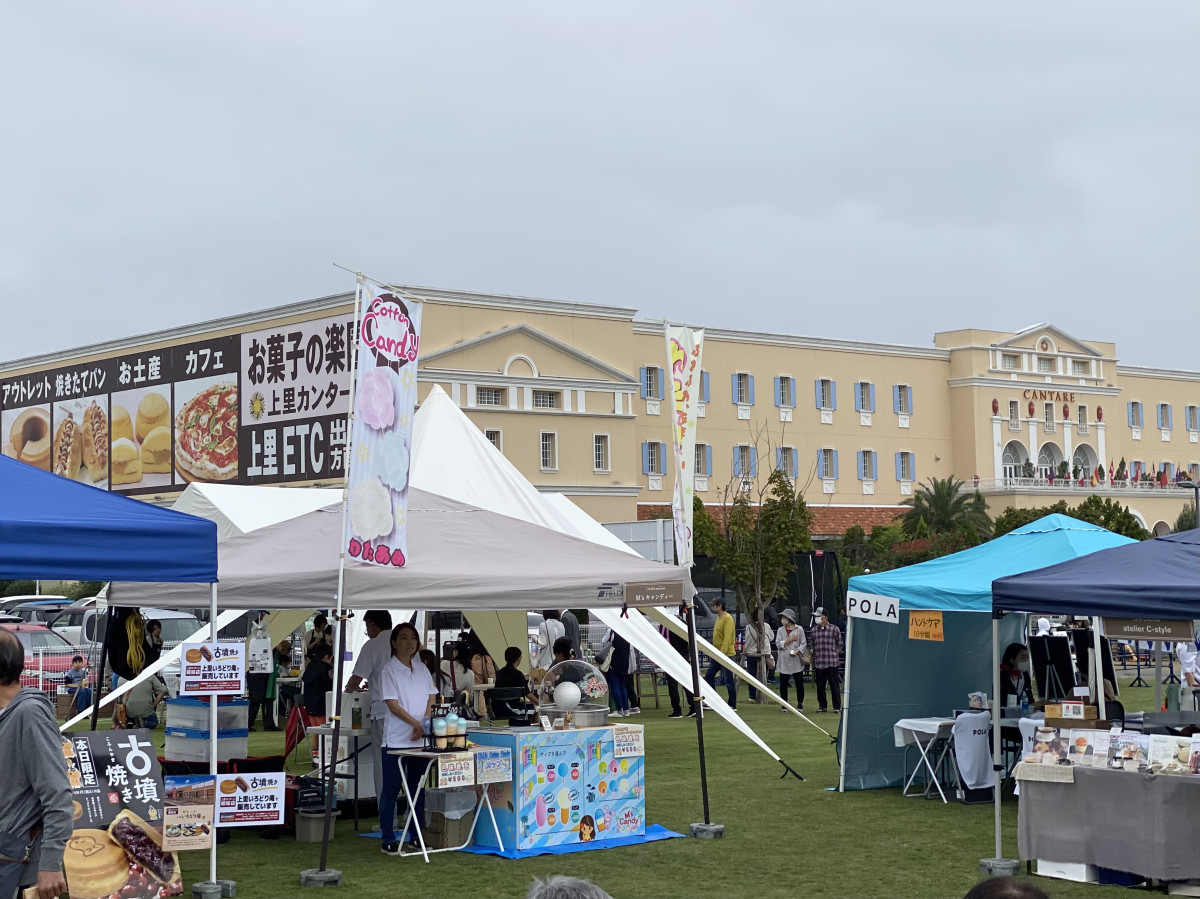 このはなパーク上里の「このはな芝生広場」で開かれた「このはなマルシェ」(後方=上里カンターレ)