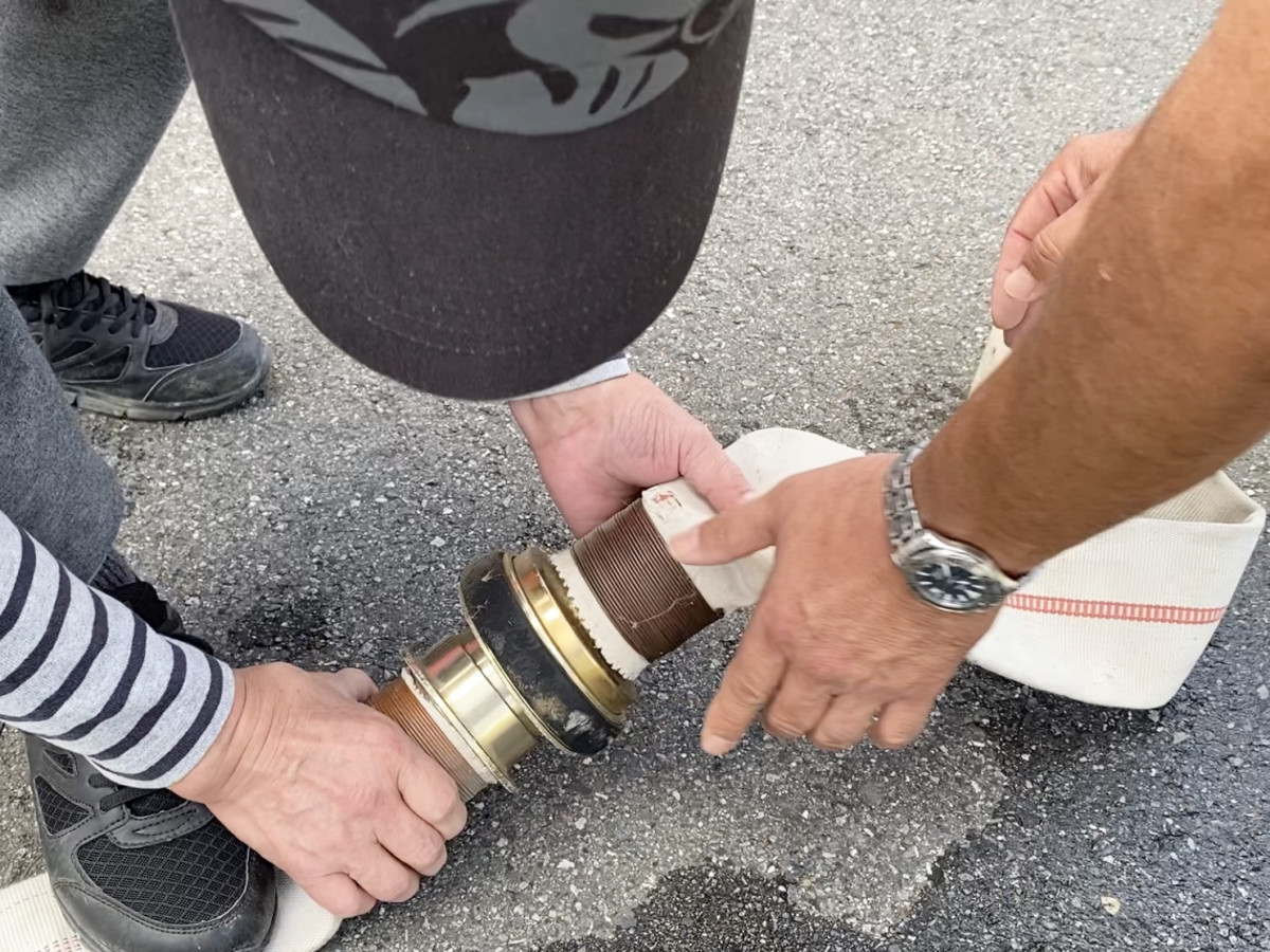 地上式消火栓を使う訓練で、ホースのオス金具とメス金具をつなげる