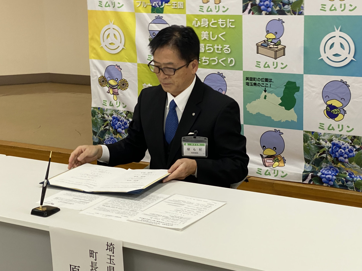 美里町役場で行われた「環境課題等に関する包括連携協定書」に調印する原田信次美里町長