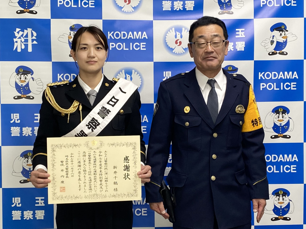 東京五輪・女子柔道70キロ級金メダリストの新井千鶴さんが11月16日、児玉警察署の一日警察署長を務めた。