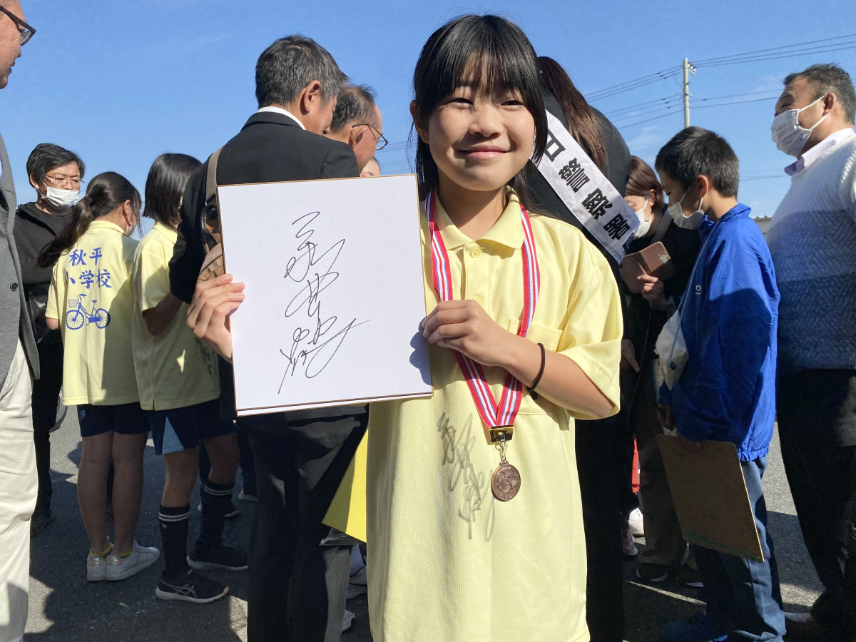 児玉署の一日警察署長を務めた新井千鶴さんのサインを手にする秋平小学校の児童