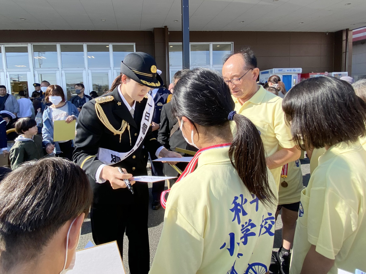 サインに応じる児玉署一日警察署長の新井千鶴さん