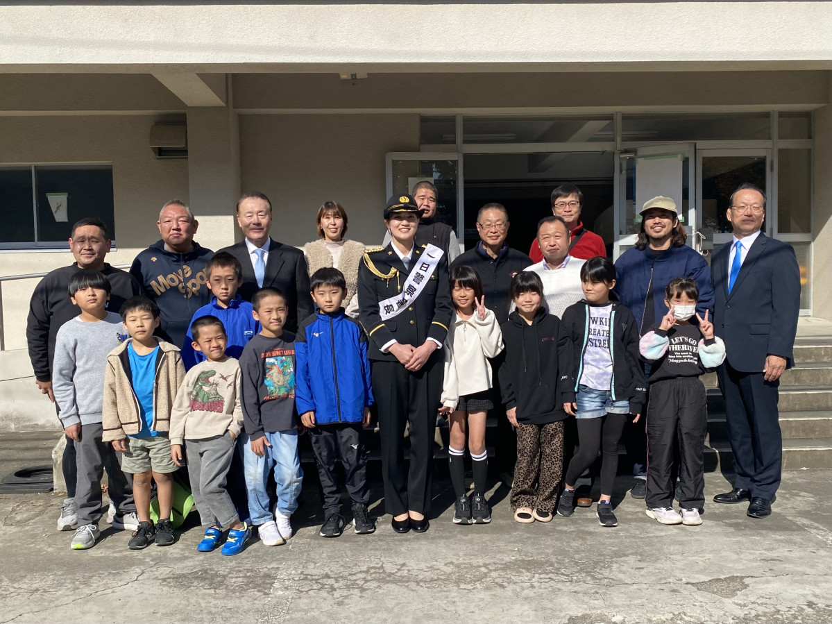 児玉署一日警察署長の新井千鶴さんと、年末特別警戒のための「冬の交通事故防止運動出発式」出席者