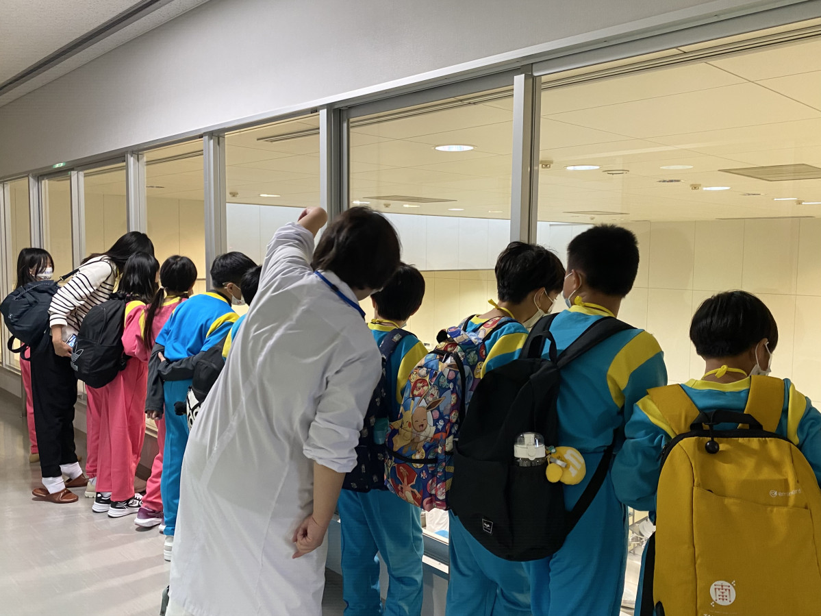 本庄上里学校給食センター2階の見学コースから調理場を見学する台南市西門実験小学校の児童ら