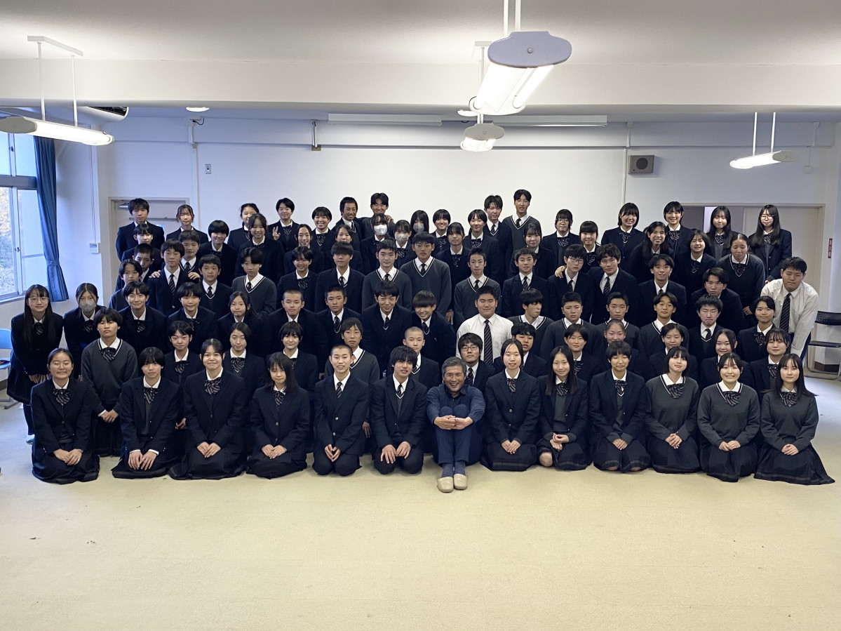 本庄第一中の全校生徒と「出前授業」をしたテレビ朝日の社員社員・吉平(よしひら)将英さん(前列中央)