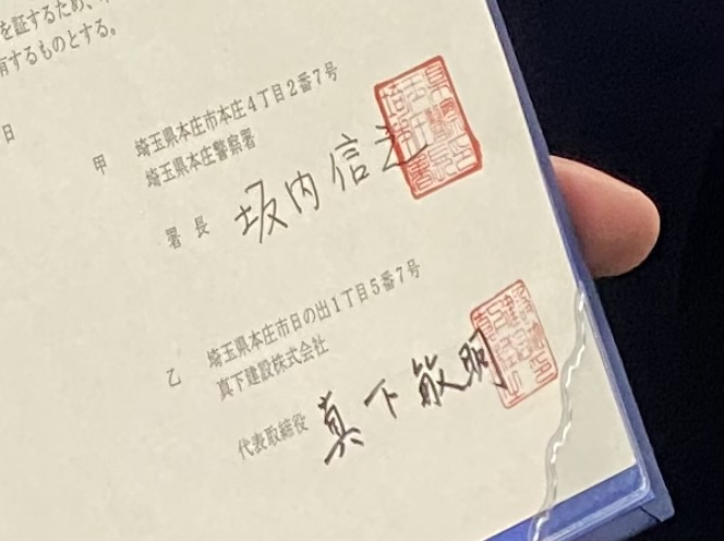 本庄警察署と真下建設(本庄市日の出1)は11月25日、「緊急事態発生時等における資機材提供等に関する協定」を締結した。