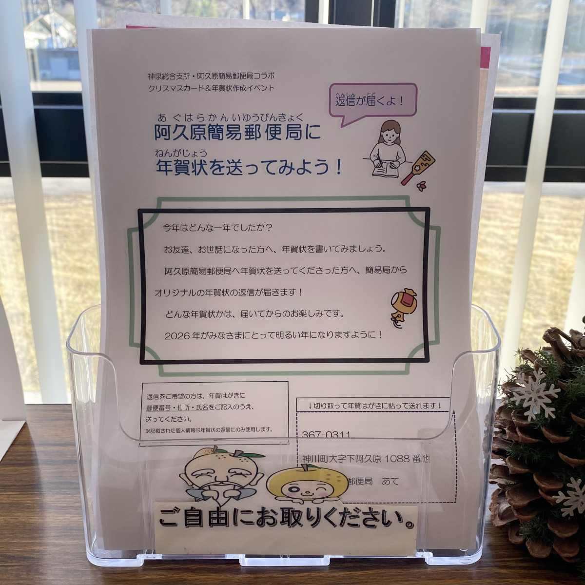 神川町の神泉総合支所が現在、併設する阿久原簡易郵便局と連携し、年賀状作成イベントを開いている。