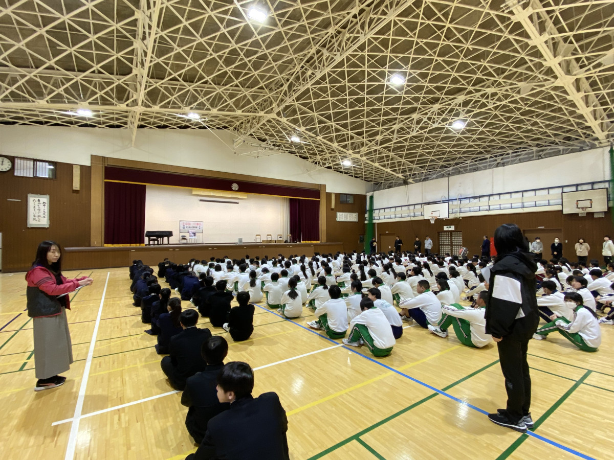 不審者対応訓練で、体育館に避難した本庄西中生ら