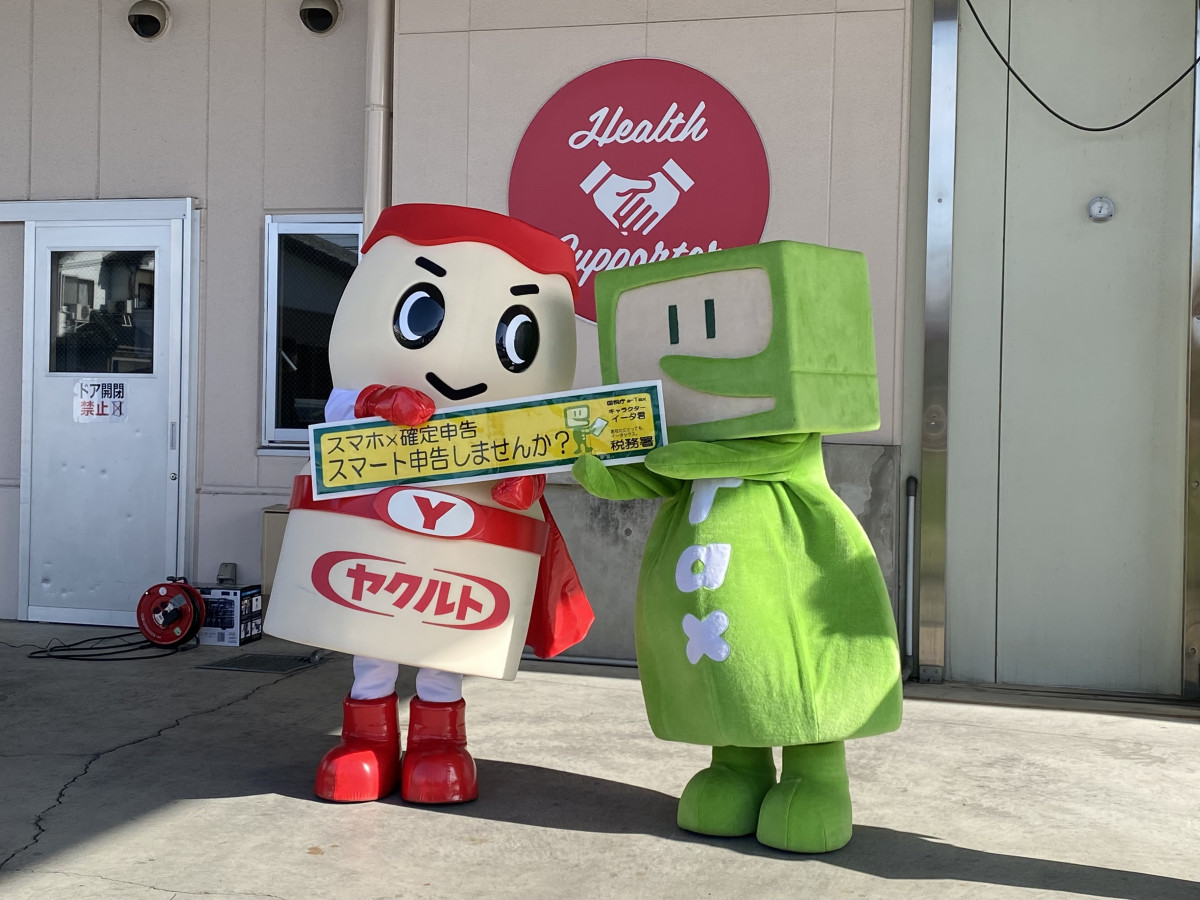 確定申告広報「ヤクルト出発式」に駆けつけたヤクルトマンとイータ君