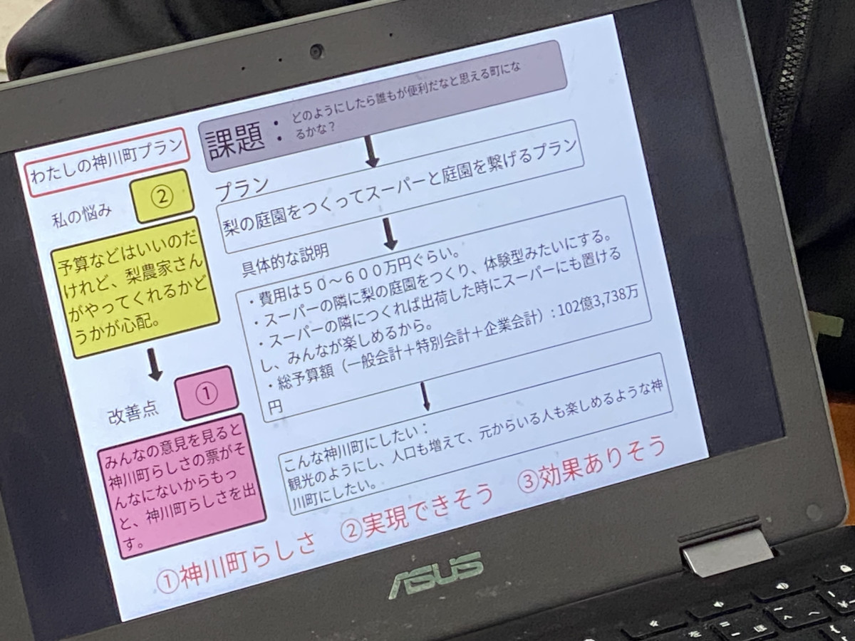 神川町立青柳小学校(神川町二ノ宮)の6年児童7人が2月16日、同町役場を訪れ、同校の6年児童が作成した「神川町プラン」を桜澤晃町長に提出した。