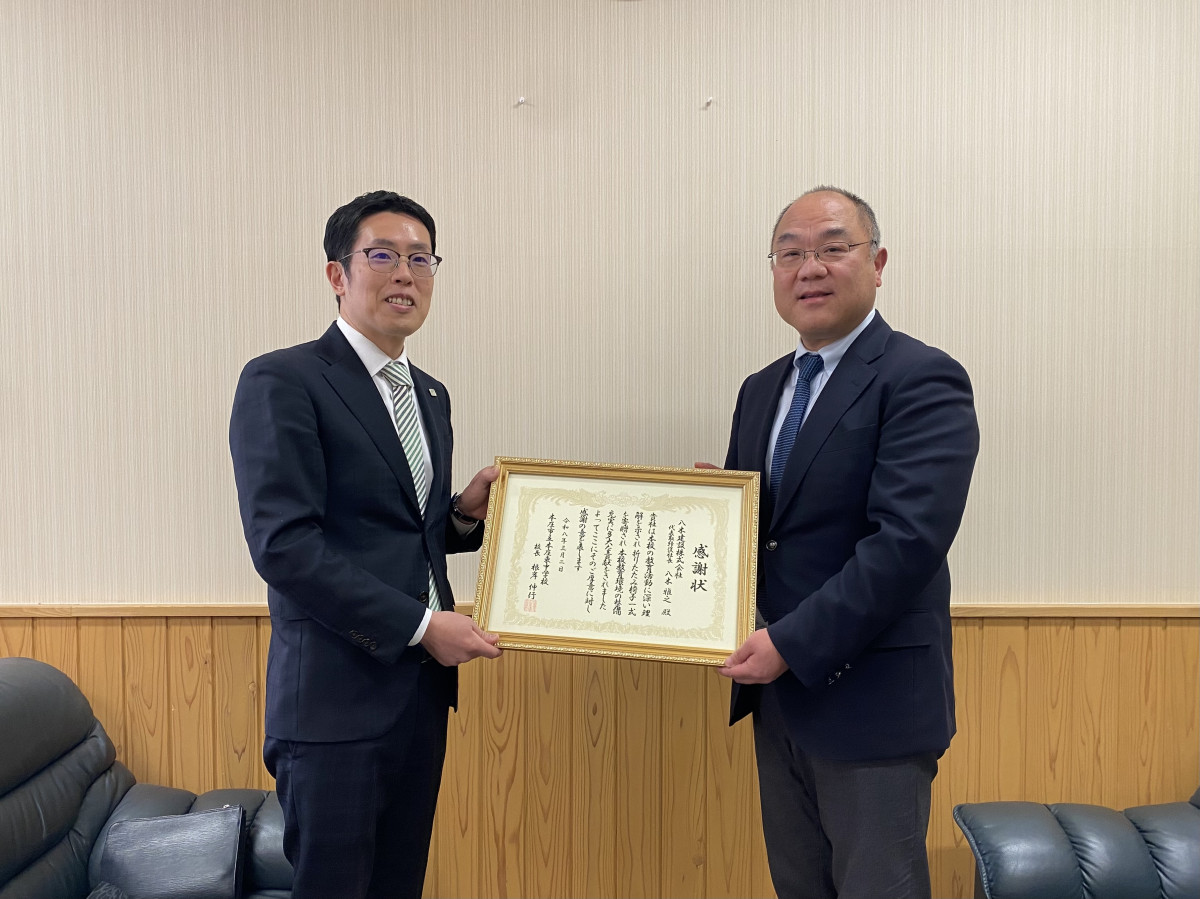 八木建設の八木雅之社長と本庄東中学校の根岸伸行校長