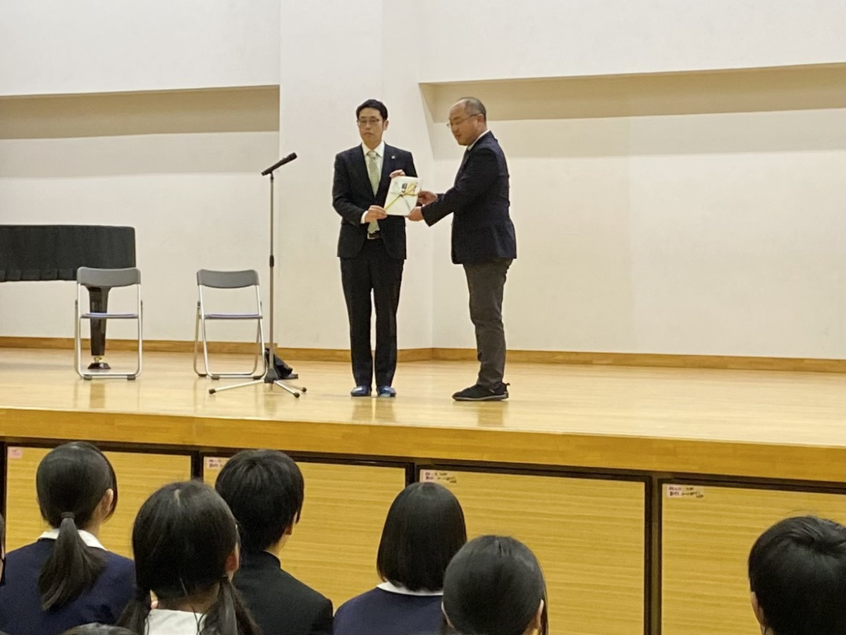 贈呈式で、八木建設・八木雅之社長から本庄東中学校・根岸伸行校長に目録