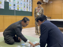 「ふれあい訪問」で上里町立郷土資料館を訪れた大野元裕埼玉県知事、山下博一上里町長、同町教育委員会の林道義学芸員